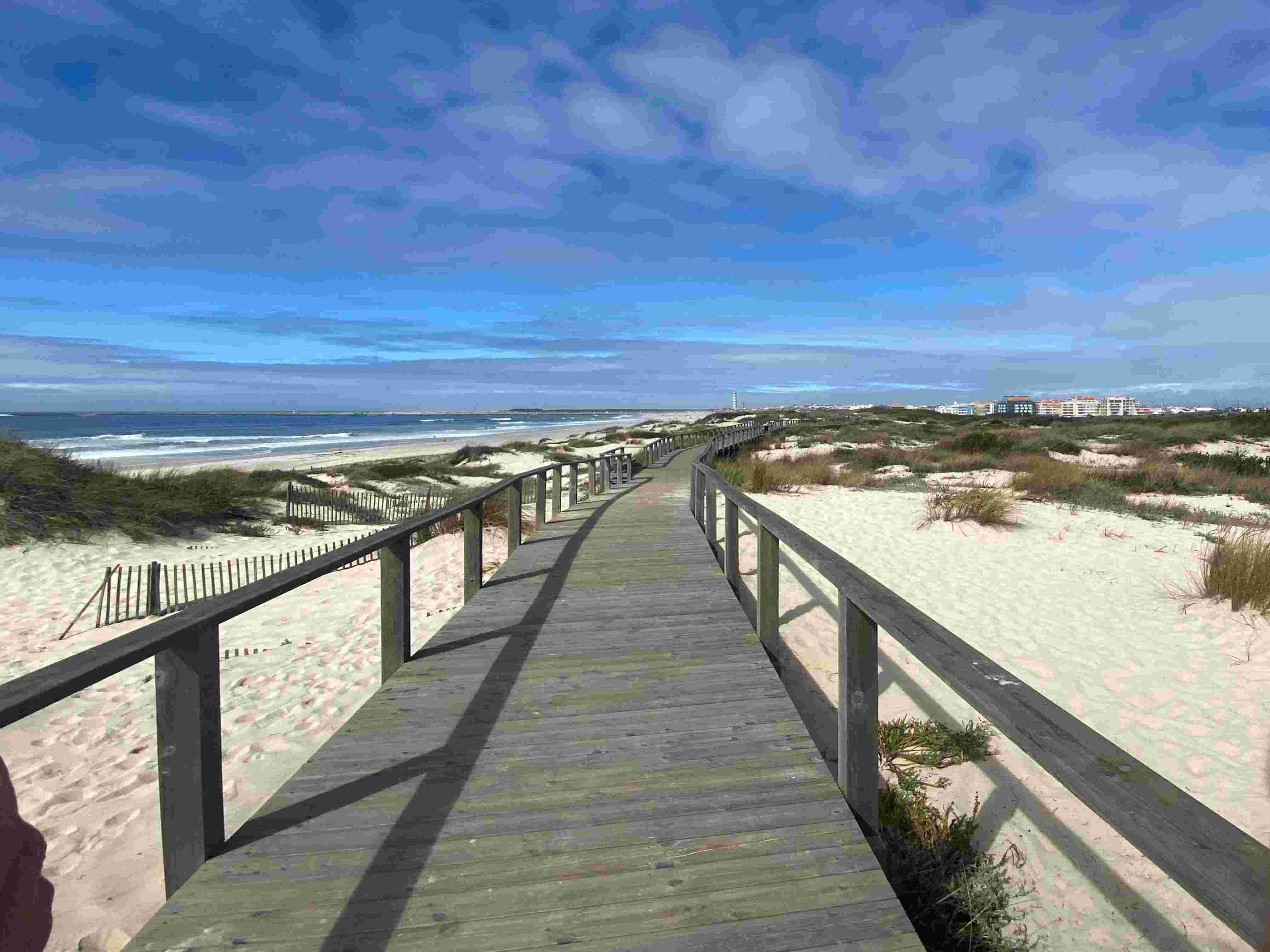 Une immense plage de sable fin séparée de la ville par une dune, et un cheminement tout en bois au bord de cette dune. C'est une belle balade.