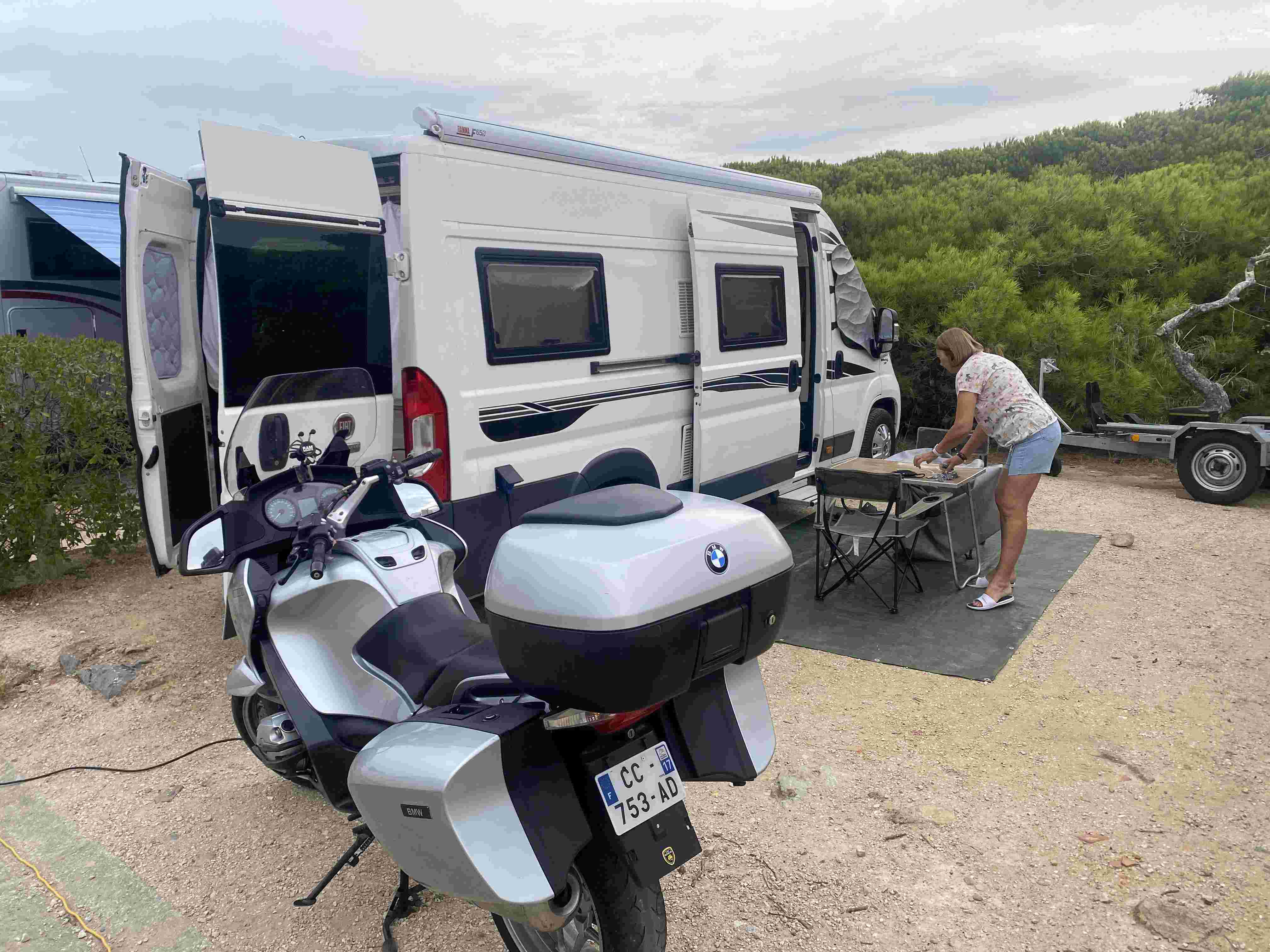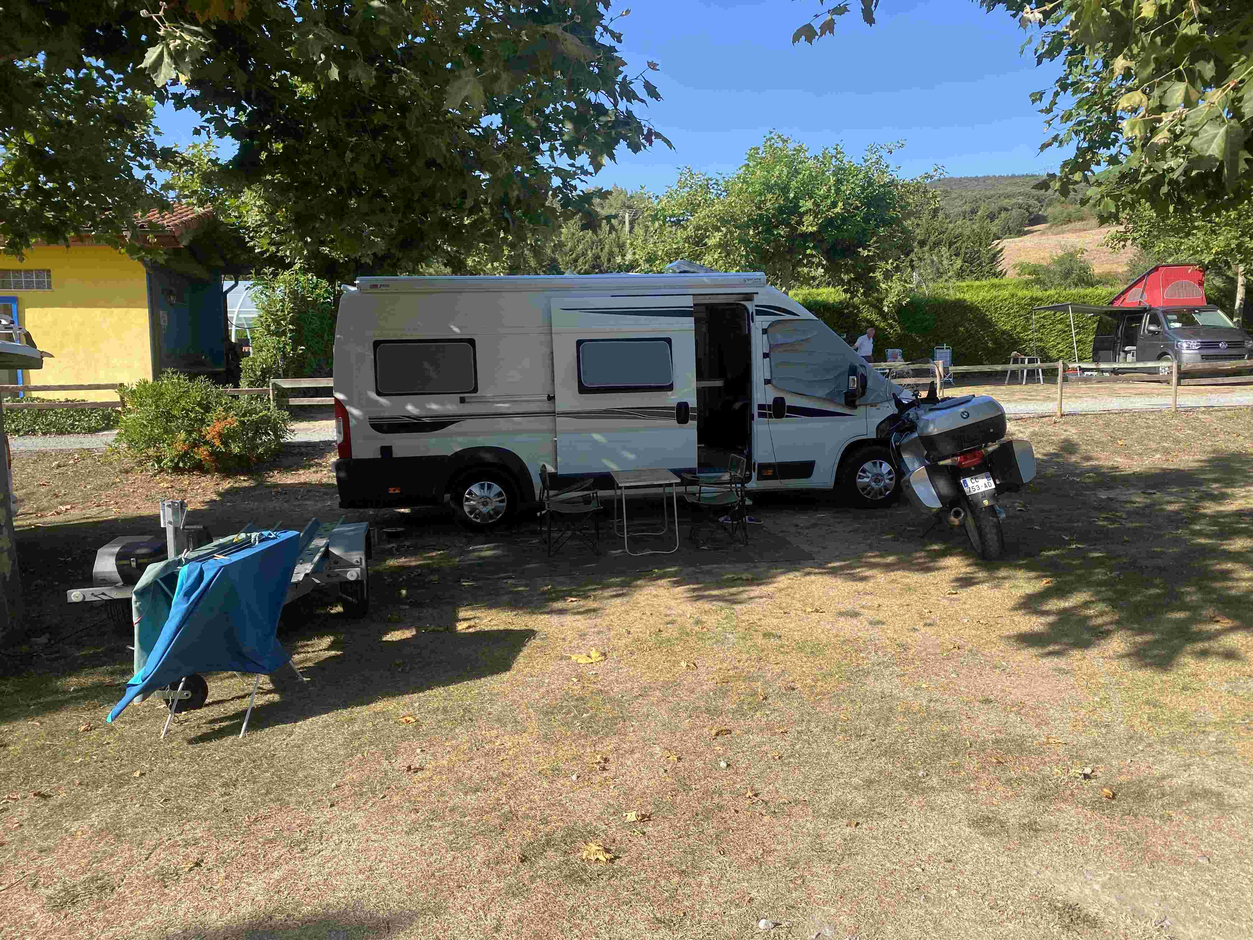 Bref, nous trouvons une place entre deux camping-cars sur la partie la plus plate de l'établissement. Juste la place de sortir l'auvent la table et les deux chaises.